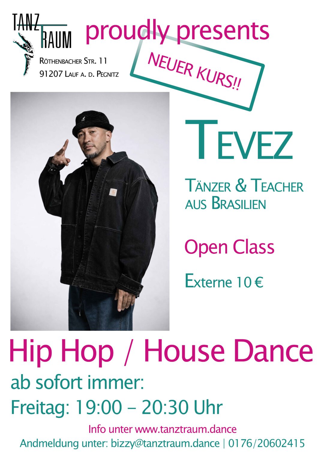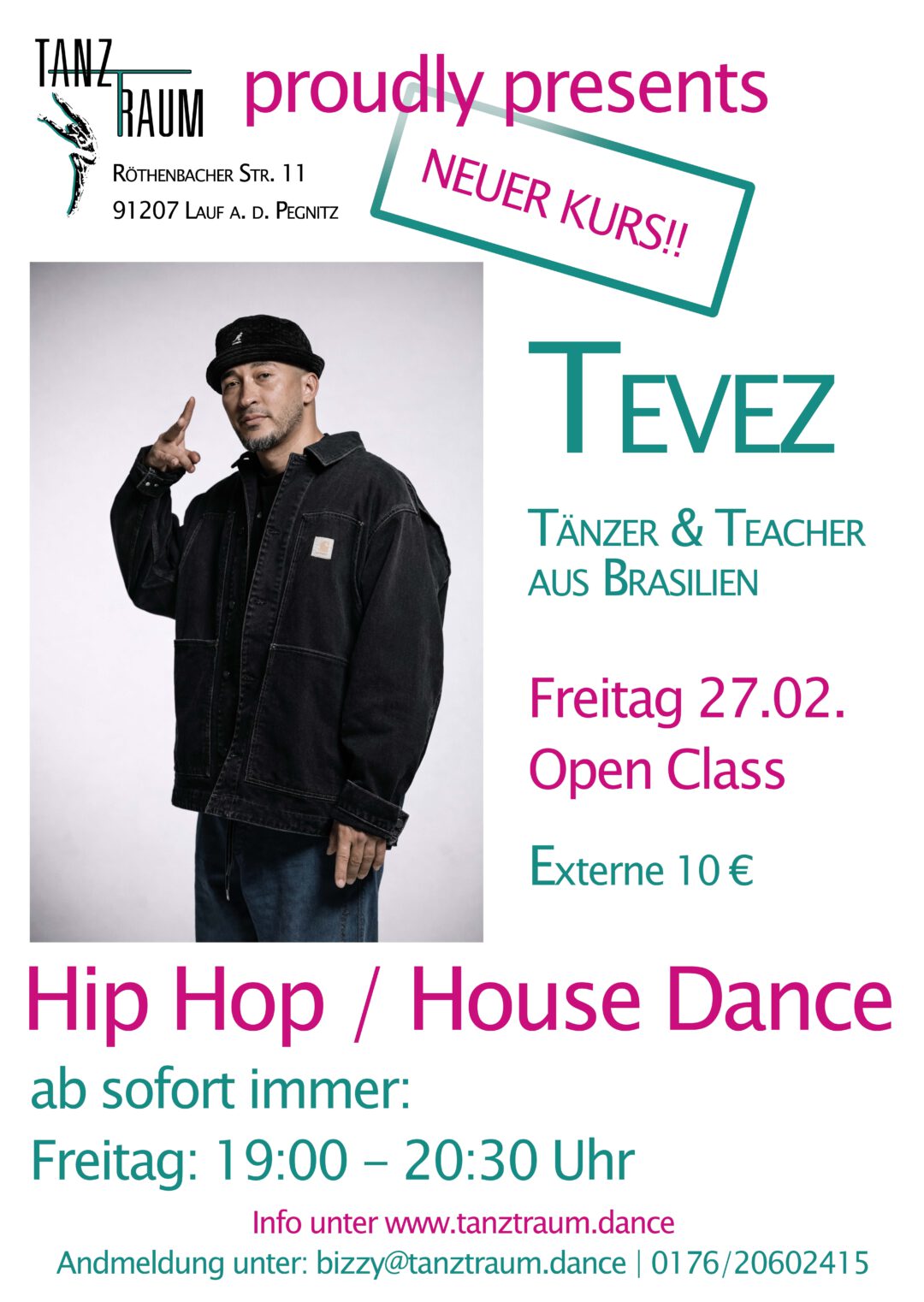 Am 27. Februar um 19:00 Uhr startet im Tanz(t)raum ein besonderes Highlight: Eine Open Class mit Tevez aus São Paulo, die gleichzeitig als Opener für unsere neue regelmäßige Freitagsstunde im Bereich Hip Hop/House Dance dient.